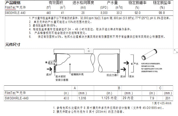 FilmTec™ SW30HRLE-440 元件有著高脫鹽率和低能耗的組合特點,同時還有著最 高有效膜面積和寬進水流道,能夠為中等和高等鹽度進水的系統(tǒng)提供可持續(xù)的 低生命周期成本。FilmTec™ SW30HRLE-440 元件有以下優(yōu)點 :