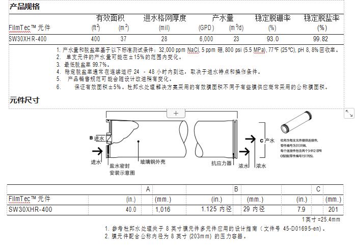 在 FilmTec™ 產(chǎn)品系列里,SW30XHR-400 元件是脫鹽率最高的海水反滲透膜元件, 多數(shù)情況下,采用一級海水反滲透系統(tǒng)就可達(dá)到嚴(yán)格的水質(zhì)要求。