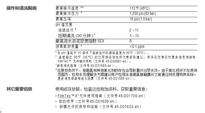 • 無需進行氧化后處理保證了在整個運行周期內(nèi)都能保持高性能。FilmTec™ 元 件更耐用,且能在更寬泛的 pH 值范圍(1-13)內(nèi)進行化學(xué)清洗。