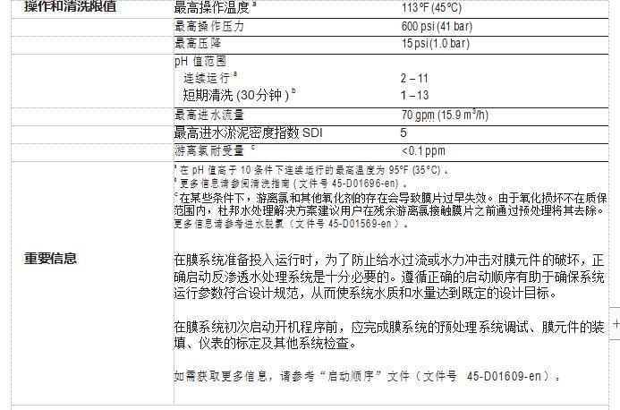 • FilmTec™ BW30-400 膜元件在生產過程中無預氯化處理,保證了高產水量和高 脫鹽率。這是為什么 FilmTec™ 元件相比其他品牌元件更耐用且可以在最寬的 pH 耐受范圍(1-13)進行化學清洗的原因。