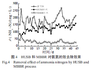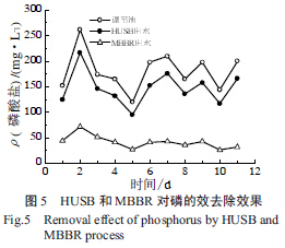 從圖4 和圖5 中可以看出,HUSB 對氨氮和磷具有一定的去除效果,平均去除率分別為18.9%和18.6%。而MBBR 對氨氮和磷去除效果,則平均分別為77.5%和72.1%。具體參見http://www.dowater.com更多相關技術文檔。