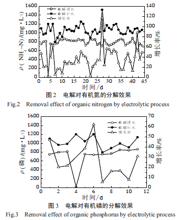 電解過程對廢水可生化性的提高作用,還表現在廢水中氨氮和無機磷濃度的增加,如圖2 和圖3所示,電解過程對有機氮的分解效果可使出水氨氮濃度水平平均增長率達34.7%。對有機磷的分解效果則可使出水磷酸鹽磷濃度水平平均增長率達26.7%,可見電解過程起到了部分分解有機物,降低了有機物濃度水平,同時電解后的混合液,氨氮和無機磷的濃度水平都有了一定幅度的提高,將使電解出水中C:N:P 的比例更適于生物降解,也即增加了廢水的可生化性。