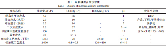 某公司所排放的甲胺磷廢水主要由甲胺磷等各種農藥制劑生產過程中產生的廢水,如甲基氯化物、二甲胺、吡蟲啉等成分混合而成,pH 約為9~10,COD 范圍在20~30 g/L,鹽度大于15%, B/C比小于0.1,可生化性差,其中,高濃度甲胺磷有機廢水總量約178.3 m3/d,低濃度甲胺磷生產廢水總量約2 000 m3/d。
