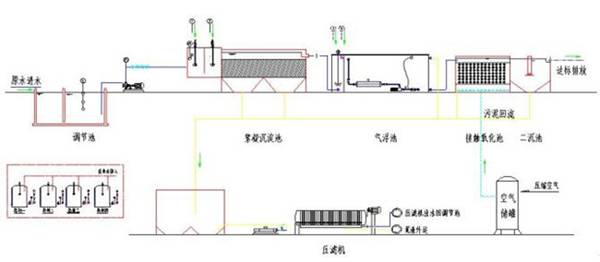 系統中一級、二級反應器和氣浮池中產生的污泥或浮渣都靠重力或水壓作用定期排人污泥濃縮池濃縮,再經自然干化后外運填埋,濃縮池的上清液回流至調節池進行物化處理。