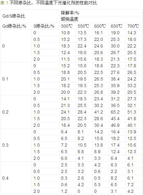 (3)摻雜釓、硫的TiO2光催化劑,在銳鈦礦晶型中含少量金紅石相時,其光催化效率比較高。