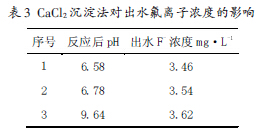 以CaCl2作為化學(xué)沉淀劑,出水中氟離子濃度小于4mg·L-1,遠(yuǎn)小于排放標(biāo)準(zhǔn)中要求的10mg·L-1,也小于氟化鈣的溶解度8.9mg·L-1,且效果穩(wěn)定。這是因?yàn)楫?dāng)水中含有氯化鈣、硫酸鈣等可溶性的鈣鹽時(shí),由于同離子效應(yīng)而降低氟化鈣的溶解度,使出水中氟離子濃度大大降低。
