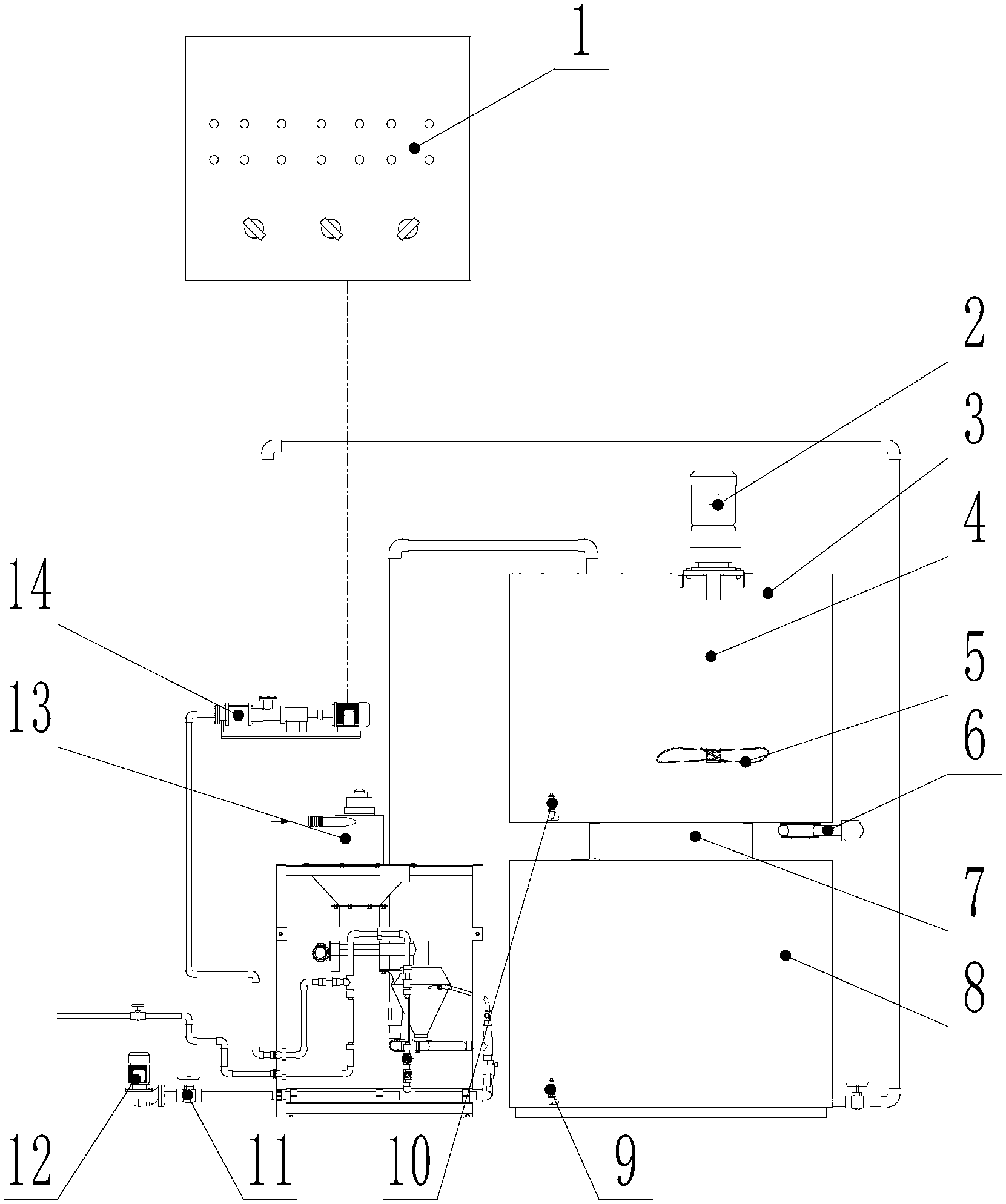 2.根據權利要求1所述的加藥系統,其特征在于,所述攪拌機包括動力裝置、攪拌軸和攪拌葉;