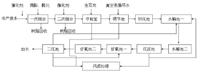酚醛樹脂生產(chǎn)過程中產(chǎn)生的高濃度含酚廢水的處理看似簡(jiǎn)單,實(shí)際具有一定的復(fù)雜性。由于廢水中除了含有高濃度的酚外,還含有大量的小分子酚醛樹脂及甲醛等其它物質(zhì)。由于苯酚和甲醛是微生物的主要抑制物,因此應(yīng)首先通過縮合手段將其除去,以提高廢水的可生化性,比較后再采用生化處理使其達(dá)標(biāo)入管網(wǎng)。廢水處理工藝流程如圖1所示。