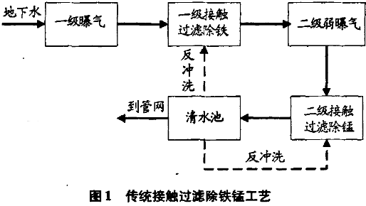 將高錳酸鉀投加到含有Mn2﹢的水中可直接將Mn2﹢氧化為MnO2,而高錳酸鉀本身則還原為MnO2,生成的MnO2經混凝沉淀過濾去除。氯氧化法與高錳酸鉀氧化法類似,但氯的氧化能力沒有高錳酸鉀強,所以實際應用中常采用MnO2覆蓋濾料與自由氯氧化相結合的除錳方法,稱為氯連續再生接觸過濾除錳法。