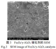 分析催化劑EDS 結果可知,催化劑表面主要是由氧、鋁、鐵3 種元素構成,因此可以得到催化劑為Fe2O3/γ-Al2O3催化劑。Fe2O3/γ-Al2O3催化劑的SEM如圖3 所示,由圖3 可知,催化劑表面的Fe2O3晶體顆粒較小,且分布均勻。這是因為超聲輻射主要源于聲空化機制,空化過程中產生的局部高壓和高溫可使液體中產生強大的沖擊波或高速射流,并以特殊能量形式加速了溶液中Fe3+ 在γ-Al2O3表面的吸附平衡,同時可以更高效地利用載體的比表面,使金屬離子在相同的載體上達到比較大量吸附平衡,從而提高了Fe3+ 在γ-Al2O3上的負載含量,增強催化劑的催化活性。