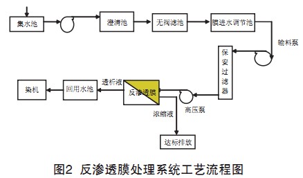 印染廢水經(jīng)過達(dá)標(biāo)處理后,在保證膜系統(tǒng)穩(wěn)定運(yùn)行 的前提下,綜合考慮投資和運(yùn)作費(fèi)用,經(jīng)多次試驗(yàn)證 明,工程水回收率設(shè)計(jì)為50%比較為理想。反滲透膜處理 系統(tǒng)工藝流程見圖2。