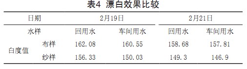 測(cè)試回用水及車間用水的漂白布樣及紗樣白度值見 表4。從表4中的數(shù)據(jù)可知,膜處理回用水漂白樣的白度 稍優(yōu)于車間用水漂白樣。