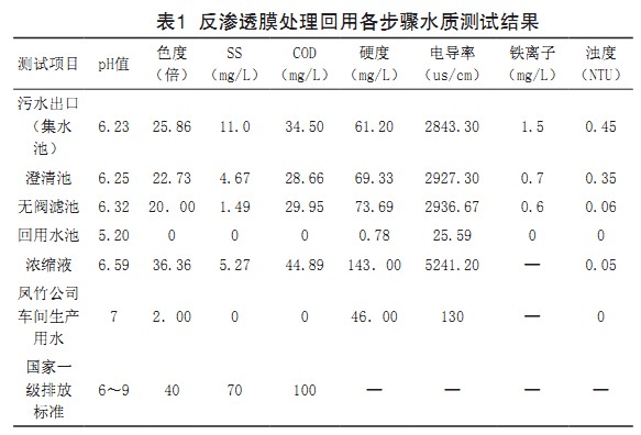 1.2.2 反滲透膜處理回用各步驟水質(zhì)測(cè)試 連續(xù)一周取各步驟水樣測(cè)試水質(zhì),測(cè)試結(jié)果的平均值見表1。