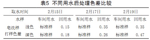 以車間生產(chǎn)用水的后處理樣為標(biāo)準(zhǔn)樣,測(cè)試回用水 后處理樣的色差見表5。
