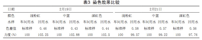 以車間用水染色樣為標(biāo)準(zhǔn)樣,測(cè)試回用水染 色樣力度及色差值見表3。