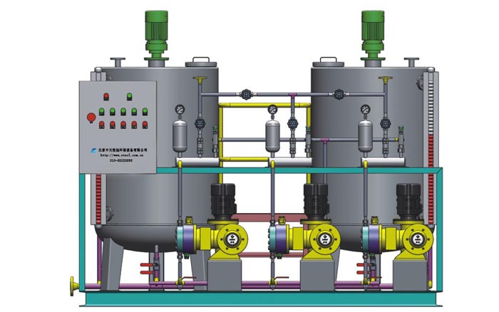 本裝置主要包括藥液溶配系統、計量投加系統、安全系統和控制系統等四部分。