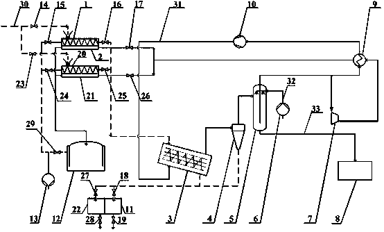 該系統包括進料裝置(1)、預熱器(2)、干燥器(3)、旋風分離器(4)、洗氣塔(5)、水泵(6)、壓縮機(7)、污水罐(8)、換熱器(9)、風機(10)、儲泥罐(11)、凝水罐(12)、真空泵(13)、閥門(14)、第二閥門(15)、第三閥門(16)、第四閥門(17)、第五閥門(18)、第六閥門(19)、第二進料裝置(20)、第二預熱器(21)、第二儲泥罐(22)、第七閥門(23)、第八閥門(24)、第九閥門(25)、第十閥門(26)、第十一閥門(27)、第十二閥門(28)、第十三閥門(29);