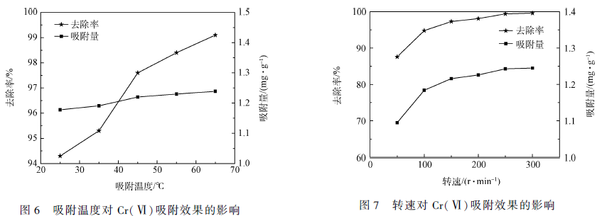 由圖6 可知,隨著反應溫度的升高,吸附劑對Cr(Ⅵ)的去除率和吸附量都有所增加,且去除率都在90% 以上,說明此吸附過程是吸熱反應,且吸附效果較好。溫度地升高,加劇了Cr(Ⅵ)離子的內擴散和外擴散速率,且其運動時所需要的活化能也得到增加。當溫度為25 ℃ 時, Cr ( Ⅵ ) 的去除率為94. 3% ,再升高溫度,處理Cr(Ⅵ)的運行成本也在不斷增加,且其去除率上升空間只在5% 左右。故考慮到成本的縮減也能夠得到較好的效果,因此選擇反應溫度為25 ℃ 。