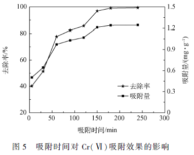 有研究表明,pH 值的大小會會影響吸附劑表面的活性基團的存在狀態和Cr(Ⅵ)在水中的化學形態,因而對Cr(Ⅵ) 的去除效果影響很大。由圖3可知,當pH < 4. 0 時,新增加的N—H 基團與H3O +相結合,并與Cr(Ⅵ) 發生絡合作用,Cr(Ⅵ) 的去除效果較好,溶液中只存在HCrO4- 陰離子,與炭化核桃殼表面的活性基團更好地結合,故去除率較高,當逐漸增加pH 值時,溶液中Cr(Ⅵ) 存在形態較多,OH - 離子含量逐漸增加,反應體系中存在競爭吸附,故Cr(Ⅵ)的去除率與吸附量急劇下降,當pH = 2. 0時,去除率比較大為99. 1% ,滿足酸度較低時有利于吸附反應的進行。故選擇反應的pH 值為2. 0。
