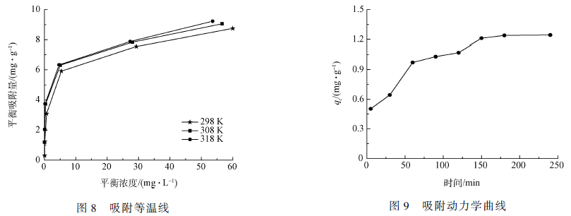 如圖8 所示,隨著反應溫度的升高,氮炭化核桃殼對吸附質(Cr(Ⅵ))的吸附量也在逐漸增加,且吸附等溫類型屬于I 型。當溫度為298 K、308 K 和318 K 時,其比較大吸附量依次為8. 751 mg·g - 1 、8. 963 mg·g - 1 和9. 151 mg·g - 1 。將實驗所得數據進行等溫模型擬合,其結果如表1 所示。