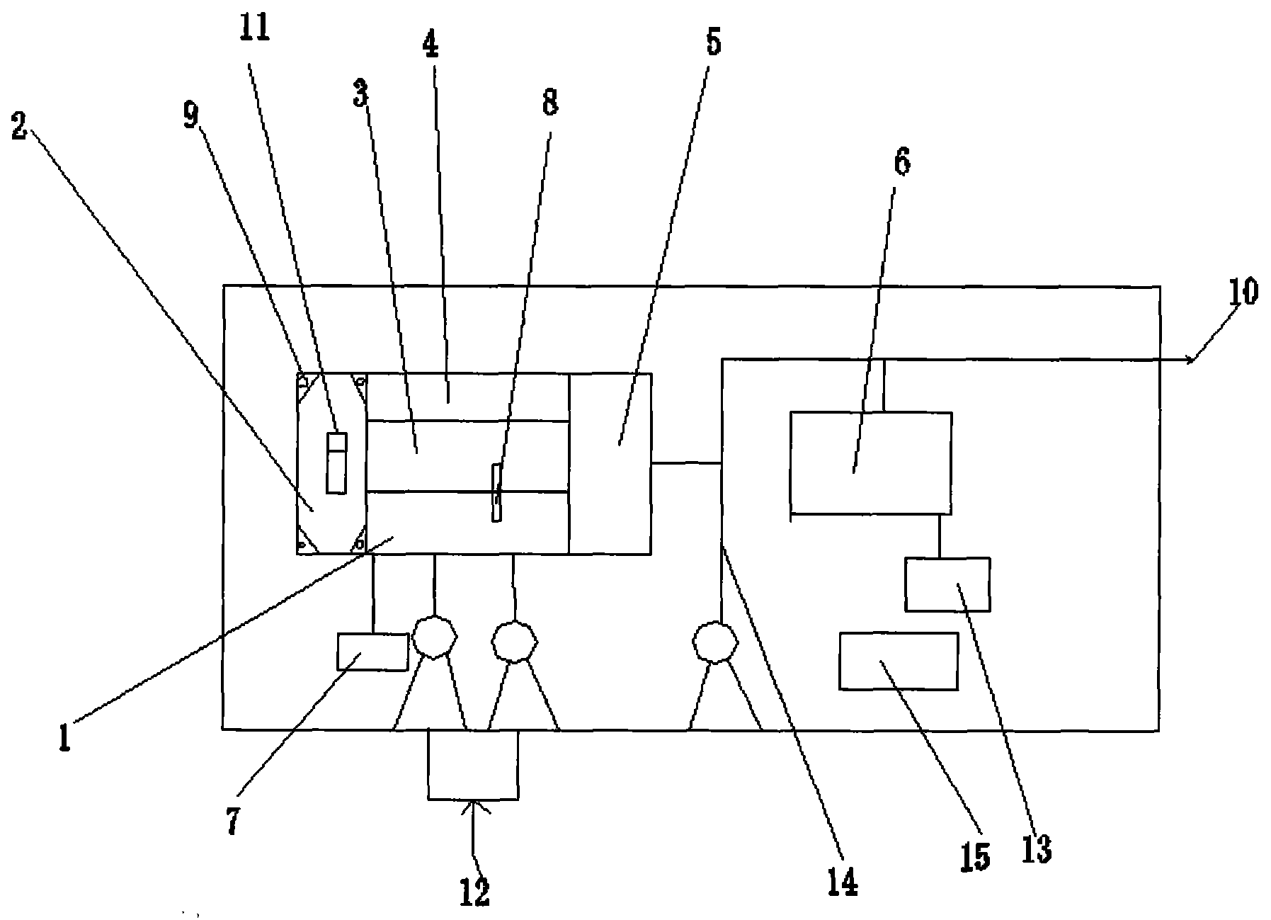 與現有技術相比,本發明的優點在于:本發明通過自控系統中的PLC中人工輸入指令,水泵系統把廢水送入預處理池、氧化裝置、反應池和混凝絮凝池中,并用加藥裝置中的藥劑添加到相應的池里和裝置中進行反應,采用紫外燈和芬頓氧化技術聯合處理法并配合相應的氧化裝置對噴漆廢水進行氧化分解處理,使得噴漆廢水中的COD去除效率達到80%以上,符合污水三級排放標準,實現環保排放,本發明價格便宜,使用方便、結構合理、自動化程度高和一體化結構,符合人們的需求,適合企業大規模推廣。