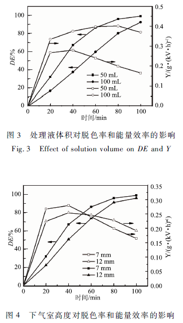 一方面,電極間距加大,放電空間內(nèi)的電場(chǎng)強(qiáng)度下降,在輸入電壓相同的條件下,下氣室高度從7 mm增加到12 mm,輸入功率從18 W下降到15 W。輸入電能減少,使放電空間中活性物質(zhì)減少,導(dǎo)致脫色率和能量效率下降。
