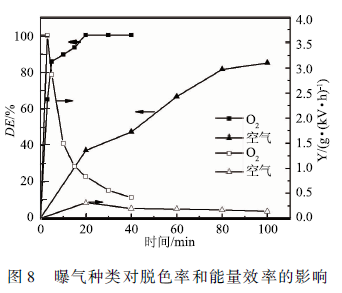 實(shí)驗(yàn)采用初始濃度為100 mg/L,體積50 mL,初始pH為4. 0,電導(dǎo)率為150 μS /cm的MB溶液,分別采用空氣、O2曝氣,氣體流量60 SCCM,上、下氣室高度分別為7. 5和7 mm,輸入電壓6 kV。如圖8所示,氧氣可以在20 min內(nèi)使MB的脫色率達(dá)到99. 98 %,而空氣需要100 min才能將MB脫色85.3 %。氧氣曝氣時(shí),處理3min能量效率比較高,比較高可達(dá)3.63 g / (kW · h),而空氣曝氣時(shí)比較大能量效率在20 min時(shí)達(dá)到比較大,比較大能量效率為0. 31 g / (kW · h)。