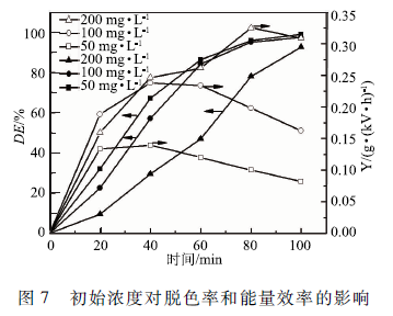 實(shí)驗(yàn)采用50 mL初始pH為4. 0,初始濃度分別為50,100和200 mg/L ,電導(dǎo)率分別為84,150和200 μS /cm的MB溶液,空氣流量60 SCCM,上、下氣室高度分別為7. 5和7 mm,輸入電壓6 kV。如圖7所示,MB的脫色率隨初始濃度的增加而下降,而能量效率隨初始濃度的增加而升高。