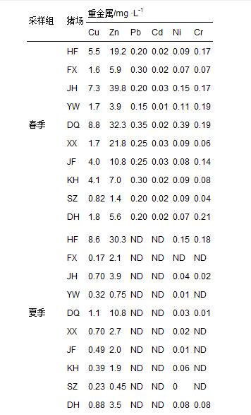 春季采樣組中豬場沼液的重金屬檢出濃度比較高,6種重金屬在10家豬場沼液中都有檢出. 銅和鋅的濃度分別為0.82~8.8 mg ·L-1和1.4~39.8 mg ·L-1,所有豬場均超過《畜禽養殖業水污染物排放標準》(征求意見稿)中規定的銅(0.5 mg ·L-1)和鋅(1.5 mg ·L-1)排放限值. 鉛濃度在0.15~0.35 mg ·L-1之間,鎳和鉻的濃度相差不大,分別為0.07~0.15 mg ·L-1和0.04~0.21 mg ·L-1,6種重金屬中鎘的濃度比較低,為0.01~0.03 mg ·L-1. 關于豬場豬糞中重金屬含量的報道中,Cu和Zn的含量也是比較高的.