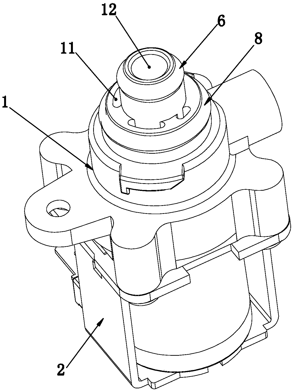 本實用新型進一步設置為:介質(zhì)流出通道設于閥體上對于設置電磁機構(gòu)一端的另一端,介質(zhì)流出通道為延伸至閥體連接腔內(nèi)的管體,該管體的周邊設置若干個與連接腔導通的孔,該孔為介質(zhì)進入通道。