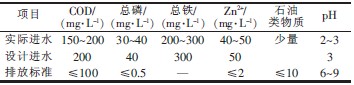 該公司日產酸洗廢水30 t,水質呈酸性,參照同類型企業的廢水特性,并針對該公司的實際情況,對該公司的污水處理站進行工程設計,設計出水水質滿足《污水綜合排放標準》(GB 8978-1996)中一級排放標準要求。同時考慮到本工程的水量小及企業的作息制度等綜合因素,設計該工程采用僅白天運行、每天運行6 h 的間歇運行方式(工程的廢水處理量為5 m3/h)。設計進水水質及排放標準見表1。