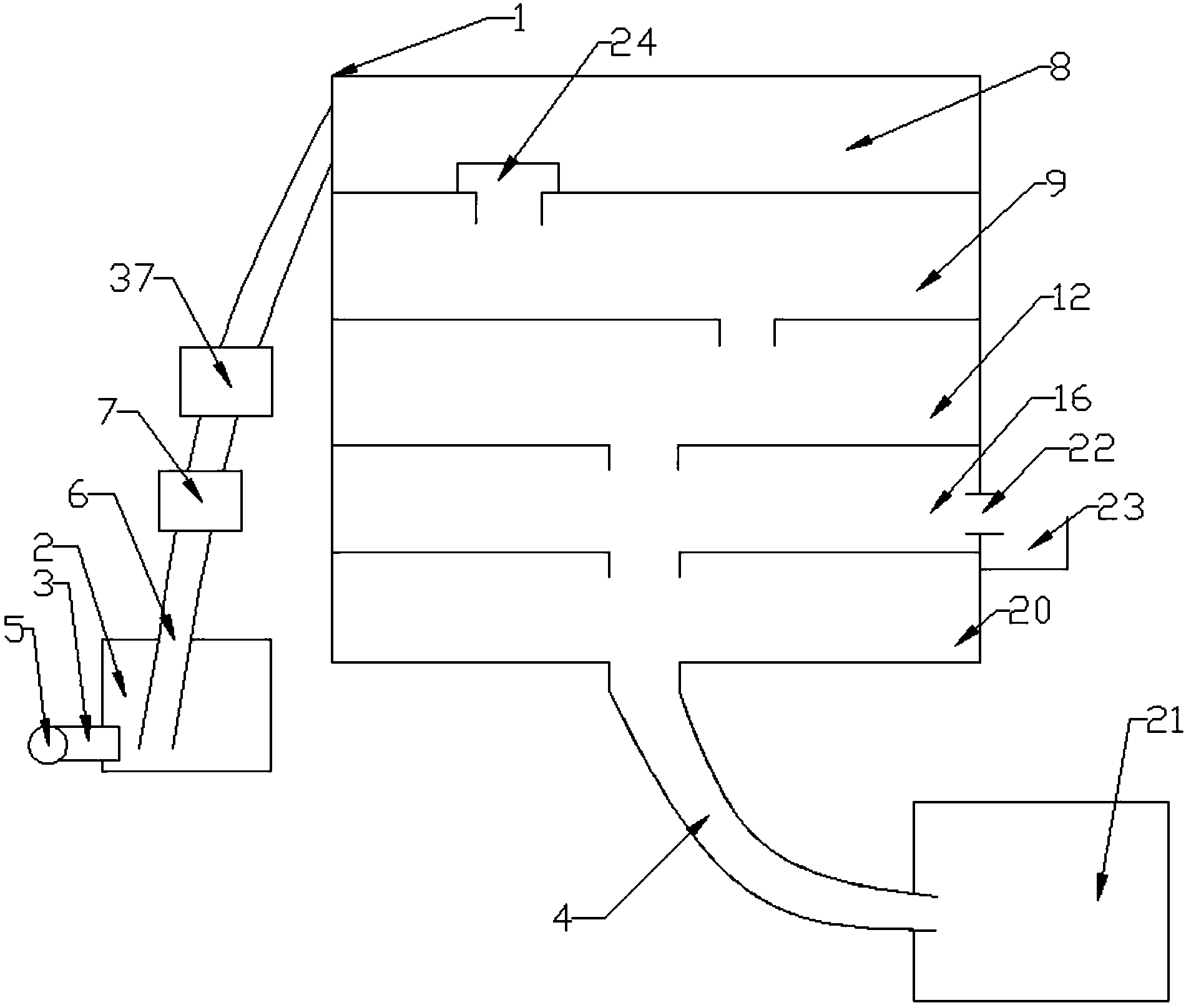 4.根據(jù)權(quán)利要求1所述的一種家用壁掛式洗澡水處理設備,其特征在于,所述活性炭過濾器(8)的出水孔(6)上端裝有防止活性炭掉落的活性炭過濾網(wǎng)(24)。