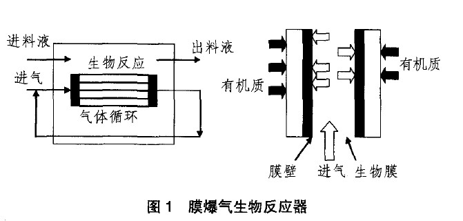 無泡曝氣生物反應(yīng)器通過致密膜或者微孔膜向生物反應(yīng)器進(jìn)行無泡曙氣。氣體分壓低于泡點(diǎn),并且氣體在膜系統(tǒng)中,提高了有機(jī)污水與膜的接觸時(shí)間,增加了傳氧效率。膜爆氣生物反應(yīng)器見圖1。
