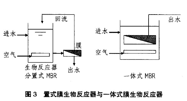 分置式膜生物反應(yīng)器通過泵對(duì)其加壓,混合液在壓力的作用下進(jìn)行過濾,這樣大分子有機(jī)物將被膜過濾出來,再回流到生物反應(yīng)器中進(jìn)行降解,如此循環(huán)操作進(jìn)一步地對(duì)有機(jī)污水中的有機(jī)物進(jìn)行分解。分置式膜生物反應(yīng)器具有穩(wěn)定、容易操作、膜容易清洗等特征,是有機(jī)污水處理的有效方法之一,但是由于為了提高循環(huán)泵的壓力會(huì)消耗較高的動(dòng)能。一體式膜生物反應(yīng)器是將膜組件置于生物反應(yīng)器中,再通過泵將過濾液抽出。分置式膜生物反應(yīng)器與一體式膜生物反應(yīng)器見圖3。