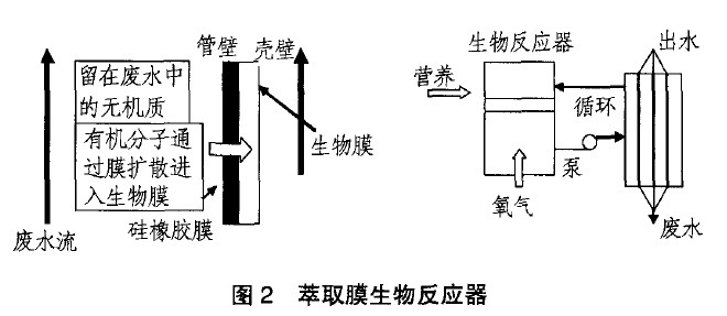萃取膜生物反應(yīng)器通過膜萃取與生物降解的方式對(duì)有機(jī)污水中難以溶解的有機(jī)物萃取出來,主要用于萃取有毒物質(zhì),再通過具有針對(duì)性的專性菌對(duì)其進(jìn)行生物降解,從而對(duì)膜生物反應(yīng)器進(jìn)行優(yōu)化氣萃取膜生物反應(yīng)器結(jié)構(gòu)見圖2。