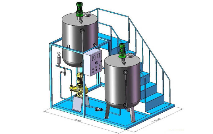 本裝置主要包括藥液溶配系統(tǒng)、計量投加系統(tǒng)、安全系統(tǒng)和控制系統(tǒng)等四部分。