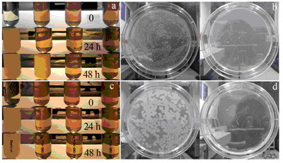 圖 4 Ag-PDA-石墨烯復合粒子對E.coil (a,b)和B.subtilis (c,d)的抗菌效果