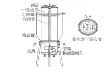 自制復頻超聲波污水處理裝置〔10〕見圖 1。其中 A-A 剖視圖主要體現(xiàn)3 個換能器的平面布置。