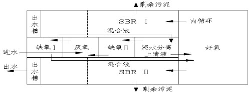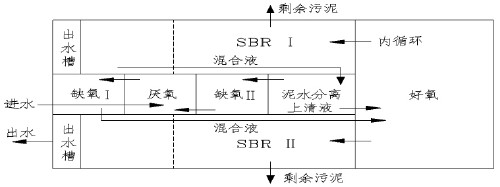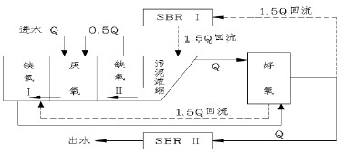 運(yùn)行過(guò)程中,污水首先進(jìn)入?yún)捬醭兀c來(lái)自泥水分離池、并經(jīng)缺氧池Ⅱ反硝化后的混合液混合,使聚磷菌在此充分釋磷,然后進(jìn)入缺氧池Ⅰ繼續(xù)進(jìn)行反硝化。反硝化后的混合液進(jìn)入好氧池,完成有機(jī)物去除、硝化和聚磷菌的攝磷等功能,比較后混合液進(jìn)入SBR 池Ⅰ或SBR 池Ⅱ,在此進(jìn)行比較后的處理及泥水分離,并排出澄清出水(如圖2 所示) 。除兩個(gè)SBR 池外,工藝中其余各池均處于恒水位、連續(xù)運(yùn)行的狀態(tài),其運(yùn)行操作方式基本固定。而對(duì)SBR 池而言,當(dāng)其中一個(gè)SBR 池作為比較后處理工段時(shí),另一個(gè)SBR 池則在1.5Q 的回流量(至泥水分離池) 的條件下以硝化、反硝化的模式運(yùn)行或進(jìn)行靜止預(yù)沉淀。運(yùn)行期間始終進(jìn)行污泥回流,并首先進(jìn)入泥水分離池分離濃縮,上清液進(jìn)入好氧池,濃縮污泥進(jìn)入缺氧池Ⅱ,進(jìn)行反硝化,并消耗掉污泥中DO 和硝酸鹽,為隨后在厭氧池中的釋磷過(guò)程創(chuàng)造有利條件。