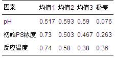 在單因素實(shí)驗(yàn)基礎(chǔ)上利用正交試驗(yàn)進(jìn)行實(shí)驗(yàn)優(yōu)化,采用3因素3位級(jí)正交試驗(yàn),正交試驗(yàn)方案與試驗(yàn)結(jié)果分析見表 1和表 2.由表 1和表 2可確定PS氧化反應(yīng)中各因素對(duì)有機(jī)物去除率影響的強(qiáng)弱順序?yàn)椋簻囟?gt;初始PS濃度>pH.其中,溫度的極差為0.36,高于其他因素,是影響有機(jī)物去除效果的主要因素.由此得到比較適宜的PS氧化條件為:pH為5.0,初始PS濃度為1000 mg · L-1,反應(yīng)溫度為75 ℃.