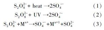 過硫酸鹽(PS)氧化作為一種新型的高級(jí)氧化技術(shù)近年來在環(huán)境領(lǐng)域逐漸受到研究人員的關(guān)注.在常溫條件下,PS是一種較為溫和的氧化劑,反應(yīng)速率較慢.當(dāng)PS受到外界條件如熱、微波、過渡金屬離子作用時(shí)容易被活化,產(chǎn)生氧化性更強(qiáng)的硫酸根自由基(SO· -4),其標(biāo)準(zhǔn)氧化還原電位E0=2.60 V,高于PS的E0=2.01 V.相應(yīng)的反應(yīng)原理如下: