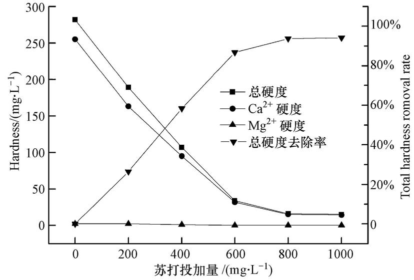 圖6 蘇打投加量對(duì)硬度和總硬度去除率的影響