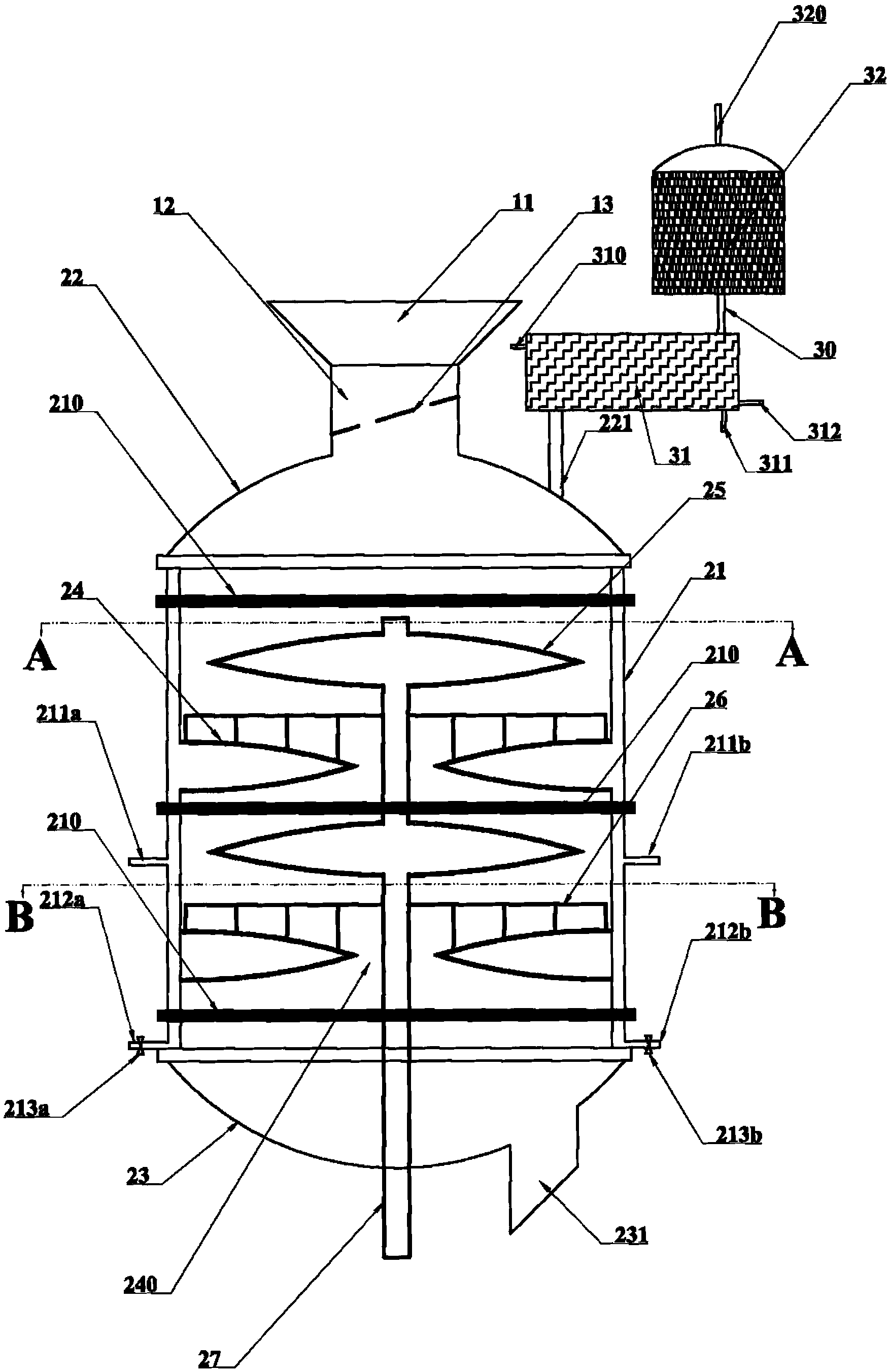 本實用新型通過以下技術(shù)方案來實現(xiàn)上述目的:一種用于污泥焚燒發(fā)電的干化預(yù)處理裝置,包括進(jìn)料系統(tǒng)1、污泥干化筒2、空氣凈化系統(tǒng)3。所述的進(jìn)料系統(tǒng)1由進(jìn)泥口11、儲泥倉12組成。所述的污泥干化筒2由筒體21、上封頭22、下封頭23組成,所述的污泥干化筒中安裝有定盤24、動盤25、鈀齒26、旋轉(zhuǎn)軸27。所述的空氣凈化系統(tǒng)由冷凝器31和活性炭吸附柜32組成。所述的儲泥倉12上部設(shè)有所述的進(jìn)泥口11,所述的儲泥倉12中設(shè)有振動篩13;所述的筒體21側(cè)壁設(shè)有蒸汽入口211a、第二蒸汽入口211b和冷凝水出管212a、第二冷凝水出管212b,所述的筒體21上中下均設(shè)有帶式管箍210;所述的上封頭22上以法蘭密封安裝有排氣管221;所述的儲泥倉12通過法蘭密封連接于所述的上封頭22的中心;所述的下封頭23底部中心設(shè)有出料口231;所述的上封頭22、下封頭23均以法蘭密封連接于筒體21上;所述的定盤24中心預(yù)留有卸料孔240;所述的冷凝水出管212a、第二冷凝水出管212b上設(shè)有電磁閥213a、第二電磁閥213b;所述的排氣管221通過螺紋連接于冷凝器31,冷凝器31通過管道30與活性炭吸附柜32連通,活性炭吸附柜32上設(shè)有放空管320,冷凝器31上設(shè)有冷凝水進(jìn)水口310、冷凝水出水口311和冷凝水循環(huán)管312。