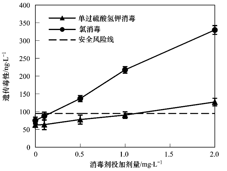 原水在氯的投加量達(dá)到0.5 mg·L-1時(shí),遺傳毒性當(dāng)量濃度為137.0 ng·L-1,已高于安全風(fēng)險(xiǎn)閾值(94.8 ng·L-1),隨著氯投加量的增大,遺傳毒性呈較為快速增長的趨勢. 原水中投加氯消毒后的遺傳毒性明顯高于單過硫酸氫鉀復(fù)合粉消毒,并且明顯高于安全風(fēng)險(xiǎn)閾值. 但在單過硫酸氫鉀復(fù)合粉投加量達(dá)到2.0 mg·L-1時(shí),遺傳毒性當(dāng)量濃度為127.1 ng·L-1,超過了安全閾值,說明當(dāng)水樣有機(jī)物較多時(shí),提高單過硫酸氫鉀復(fù)合粉的投加量也存在著一定安全風(fēng)險(xiǎn).