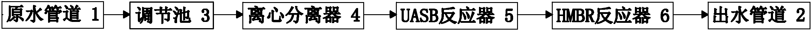 1.一種新型油田污水處理系統(tǒng),其特征在于:包括調(diào)節(jié)池(3)、離心分離器(4)、UASB反應(yīng)器(5)和HMBR反應(yīng)器(6),調(diào)節(jié)池(3)的入水口與原水管道(1)連通,調(diào)節(jié)池(3)的出水口與離心分離器(4)的入水口連接,離心分離器(4)的出水口與出水管道(2)連通,在離心分離器(4)與出水管道(2)之間設(shè)置有UASB反應(yīng)器(5)和HMBR反應(yīng)器(6)。
