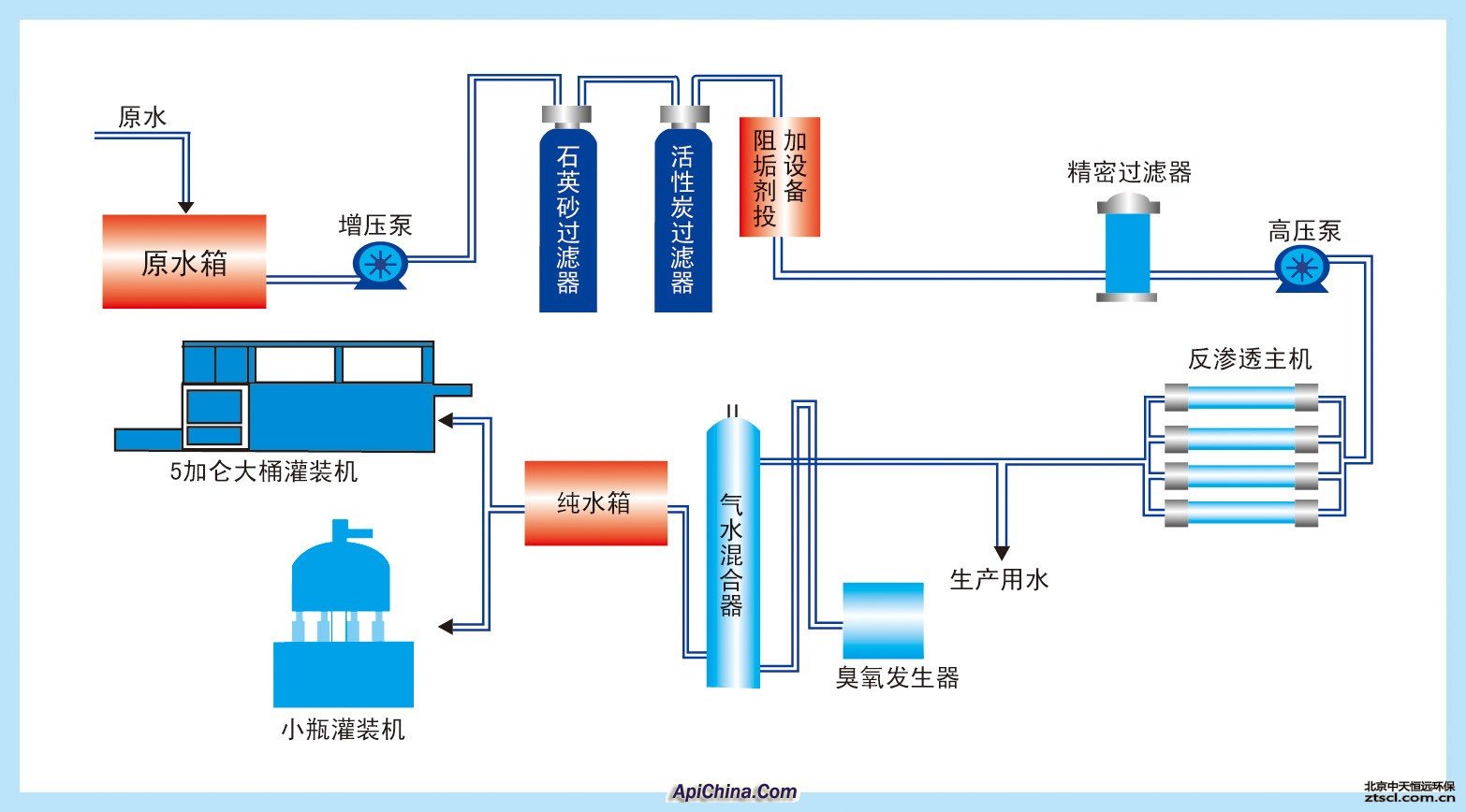 原水→ 原水泵 → 石英砂過濾 → 活性碳過濾 → 軟化過濾→ 精密過濾 →高壓泵 → 反滲透RO膜→純凈水水箱 →用水點