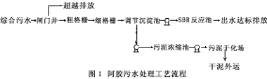 、谡{節+SBR法處理阿膠污水效果十分理想,CODcr、SS等指標的去除率均達到90%以上,并且具有剩余污泥少、耐沖擊負荷、費用低等優點,是一種高效、低能耗的污水處理工藝。
