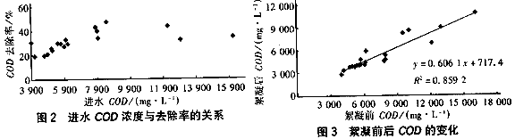 試驗把PAFC作為絮凝劑,進水COD濃度對其去除率的影響及絮凝前后COD的變化分別 見圖2、3。由圖2知,絮凝對COD的去除率相對穩(wěn)定,其值穩(wěn)定在25%~35%。絮凝前后的COD濃度相關(guān)直線斜率為0.6,相關(guān)系數(shù)>0.9(圖3)。