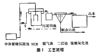 首先用石灰乳將廢水pH值中和至6.5~8,然后加入PAFC(聚合氯化鋁鐵),絮凝沉淀0.5h(COD去除率為20%~30%)后上清液進入HCR。HCR出水經(jīng)脫氣池(主要脫去附著在活性污泥表面的CO2、空氣等)脫氣后進入沉淀池進行泥水分離,HCR可去除70%~80%的COD。沉淀池出水經(jīng)接觸氧化池處理后出水達到進入城市管網(wǎng)的排放要求。