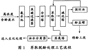 該廠各種高濃度含酚廢水流入氨水池均化,池底的焦化類物質定期抽出。高濃度含酚廢水經焦碳過濾器除油,使出水符合進生化處理裝置的要求。吸附油的焦碳定期用蒸汽吹脫。除油后的含酚廢水經冷卻器冷卻至55~65℃進入萃取塔上部。萃取劑選用N-503煤油,由循環油泵打入萃取塔底部。溶劑油與高濃度含酚廢水在萃取塔中逆流接觸,絕大部分酚轉移至溶劑油中,溶劑油由萃取塔頂溢流進入堿洗塔與堿接觸生成酚鹽。溶劑油經堿洗后進入中間油槽,循環使用。